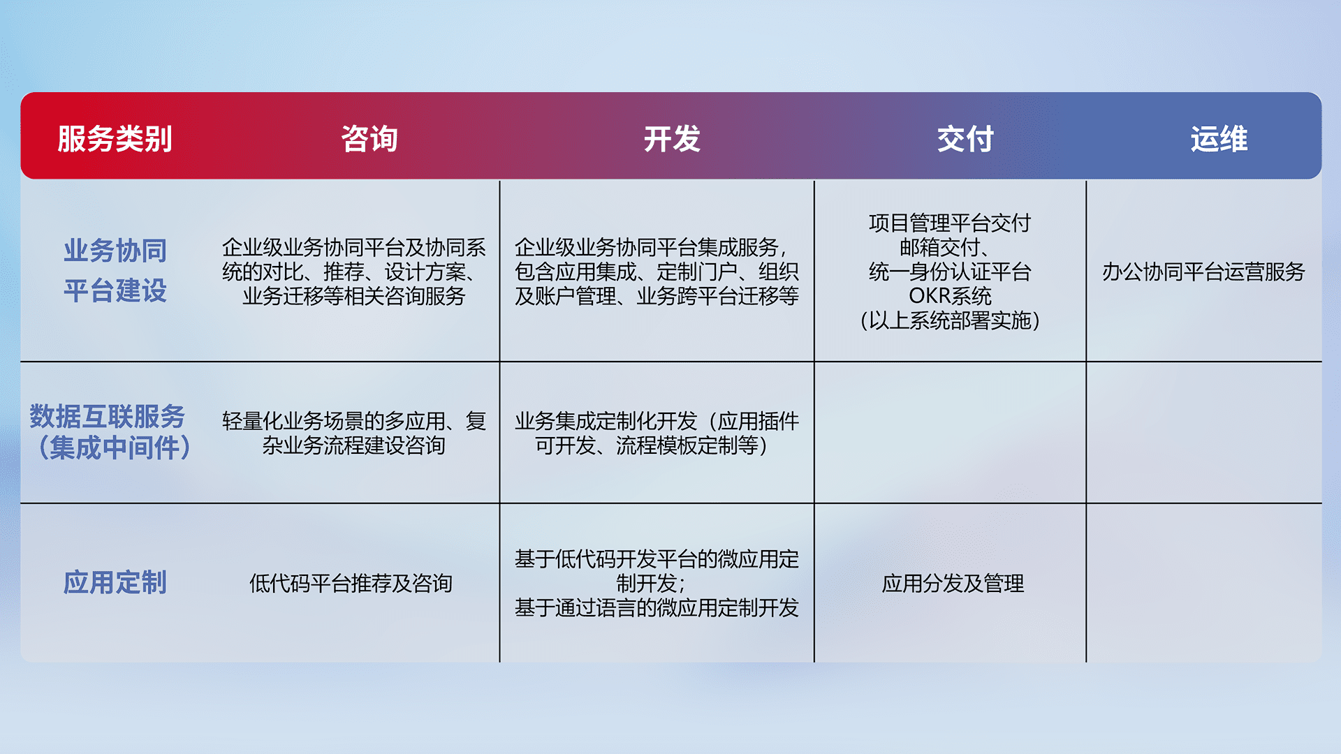 针对钉钉、、、、企微、、、、IDaas等平台级产品提供产品的规划、、方案、、、、交付、、定制化开发等服务,,实现如统一协同办公、、智能客户服务、、、、混合会议管理、、智能数据查询、、、、等业务场景,,,实现数字化转型。。
