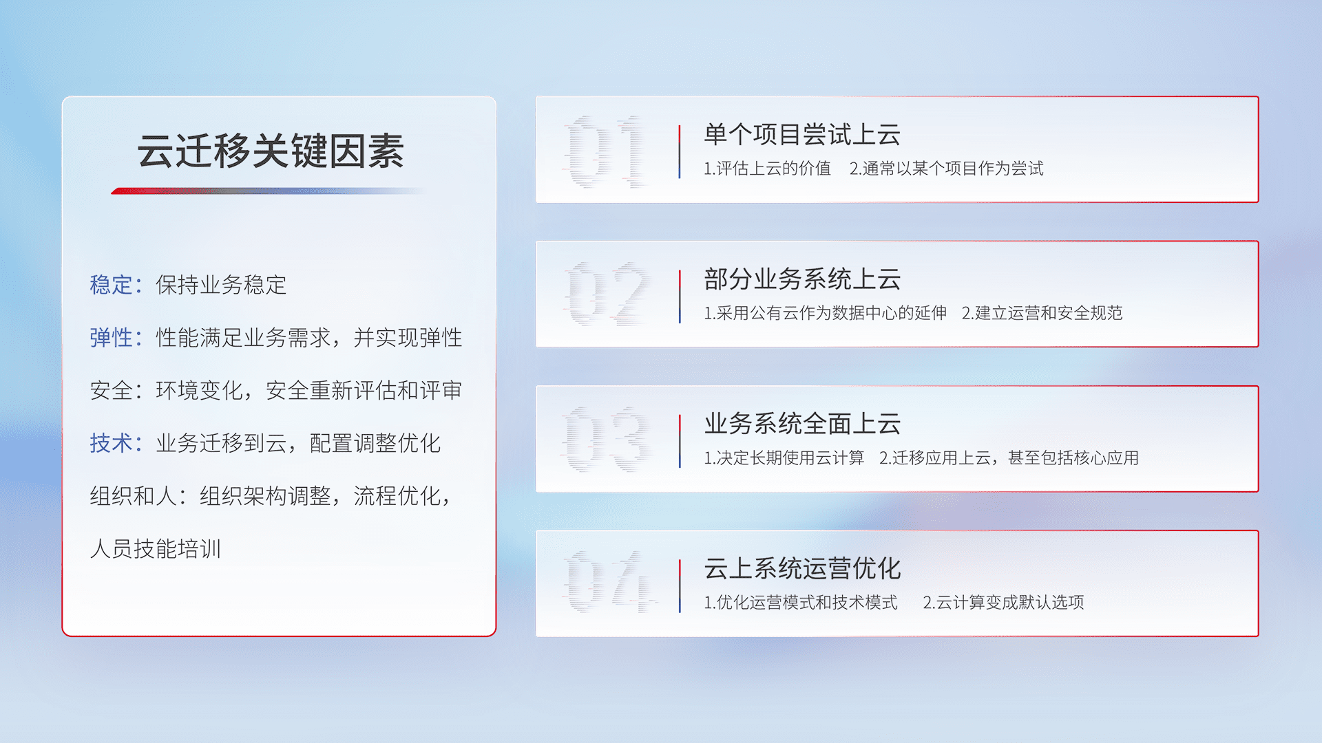 结合实际业务,,,,从规划设计、、云平台选型、、、云原生改造、、、、数据迁移、、集成交付,,迁移全过程为客户识别最佳上云路径,,,,做好风险识别管理,,,设计网络架构、、、身份权限、、、安全审计合规、、、操作审计、、日志审计、、、、监控告警策略、、、多站点容灾设计等,,对云上基础设施进行整体规划,,,,提升IT治理水平,,,,以满足弹性、、高可用、、、高性能的需求。。。。