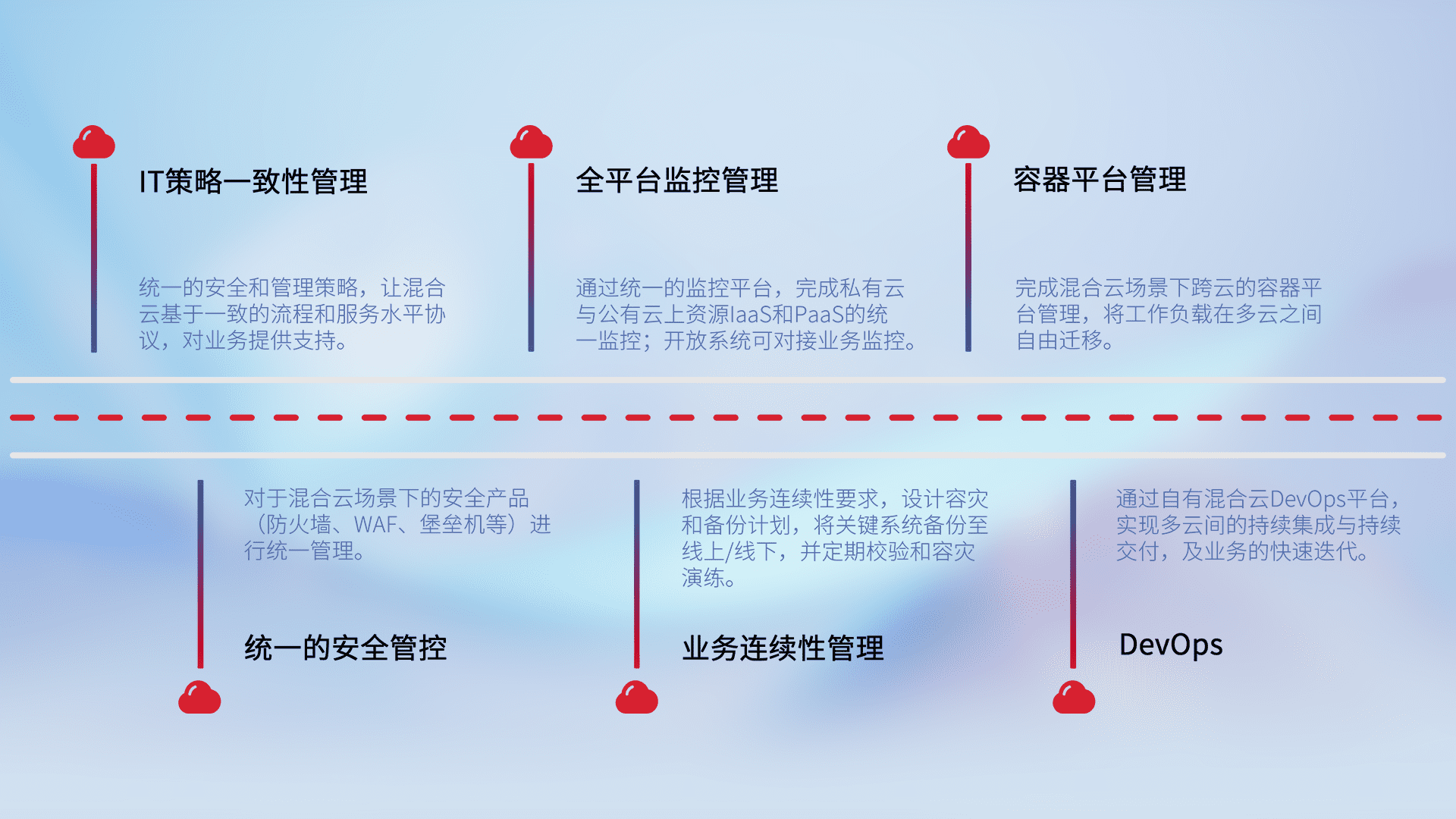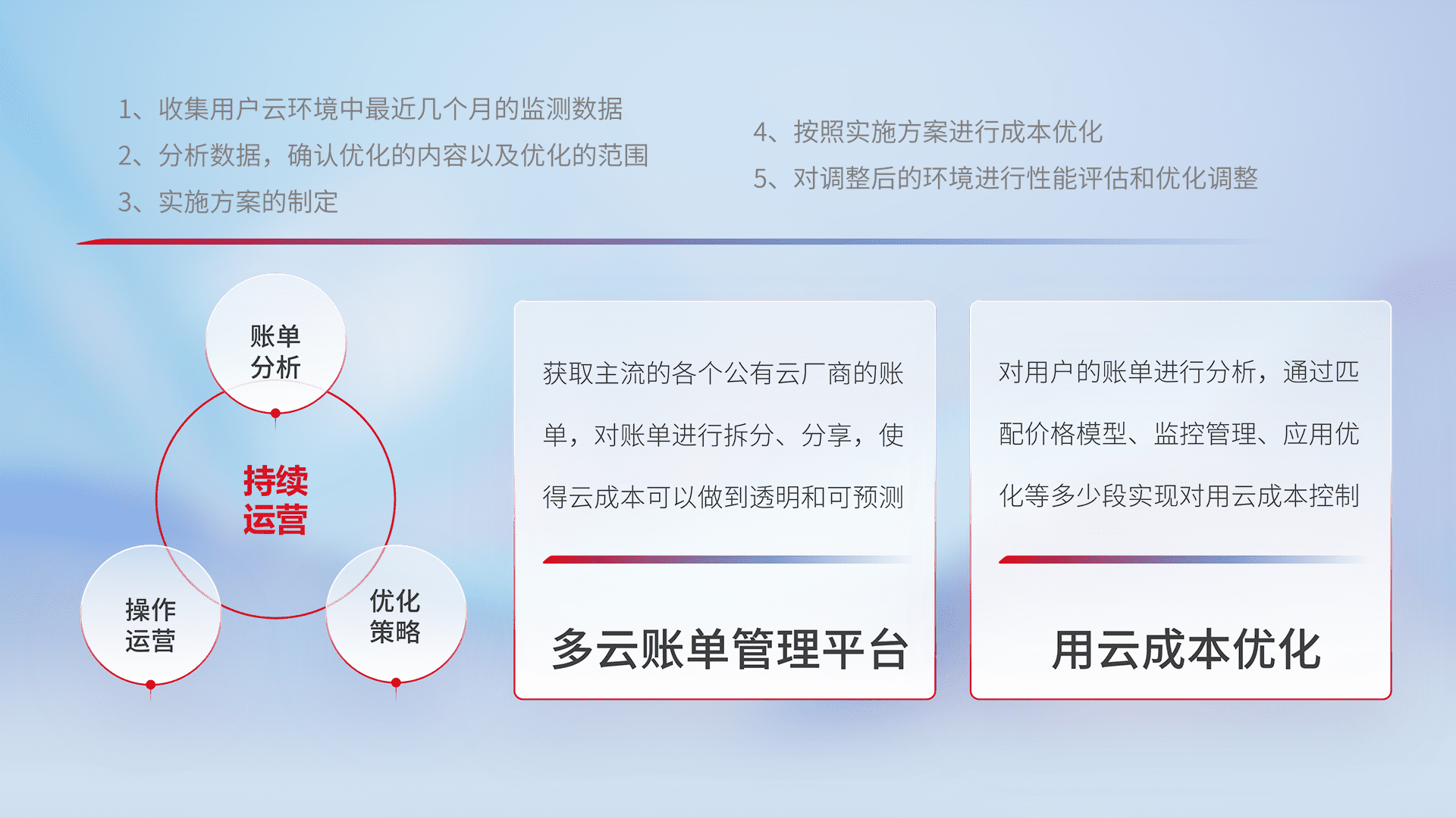 通过多云纳管,,,,以统一的资源数据模型把客户的云资源进行抽象和封装,,,,进而实现对多云资源的统一操作,,保障云资源管理的可靠性、、、稳定性与可用性。。。。量身定制化运维内容,,,配置、、、、开发运维、、、补丁管理、、备份、、监控、、、认证和访问管理、、、、审计和日常巡检等,,,,保障在用云过程中的可靠度,,,,稳定度以及高可用率。。。